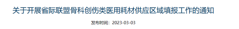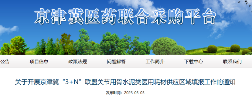 同樣在今日,京津冀醫藥聯合采購平臺發布了《關于開展京津冀“3+N”聯盟關節用骨水泥類醫用耗材供應區域填報工作的通知》《關于開展省際聯盟骨科創傷類醫用耗材供應區域填報工作的通知》。