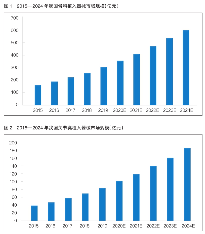 雖然我國骨科植入器械行業仍處于初級階段,但隨著人口老齡化程度的加深,以及人均醫療保健消費支出的增長,骨科植入器械市場整體規模增長迅速。根據米內網、廣州標點醫藥信息股份有限公司(以下簡稱標點信息)發布的數據,該領域市場銷售收入已由2015年的164億元增長至2019年的308億元,年復合增長率為17.03%,高于全球骨科植入器械市場的整體增長速度;預計到2024年,我國骨科植入器械市場規模將達到607億元(詳見圖1)。我國骨科植入器械行業具有較大的市場發展空間,將繼續保持快速增長的態勢。