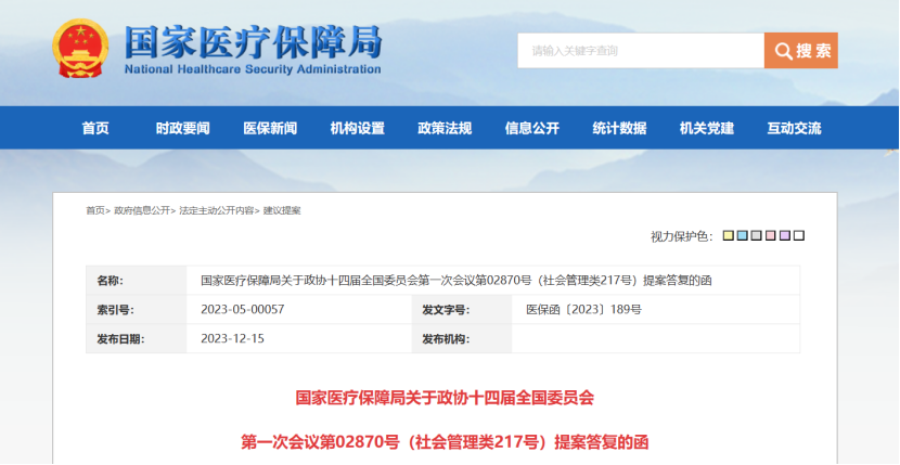 近日,國家醫保局發布《國家醫療保障局關于政協十四屆全國委員會第一次會議第02870號(社會管理類217號)提案答復的函》。