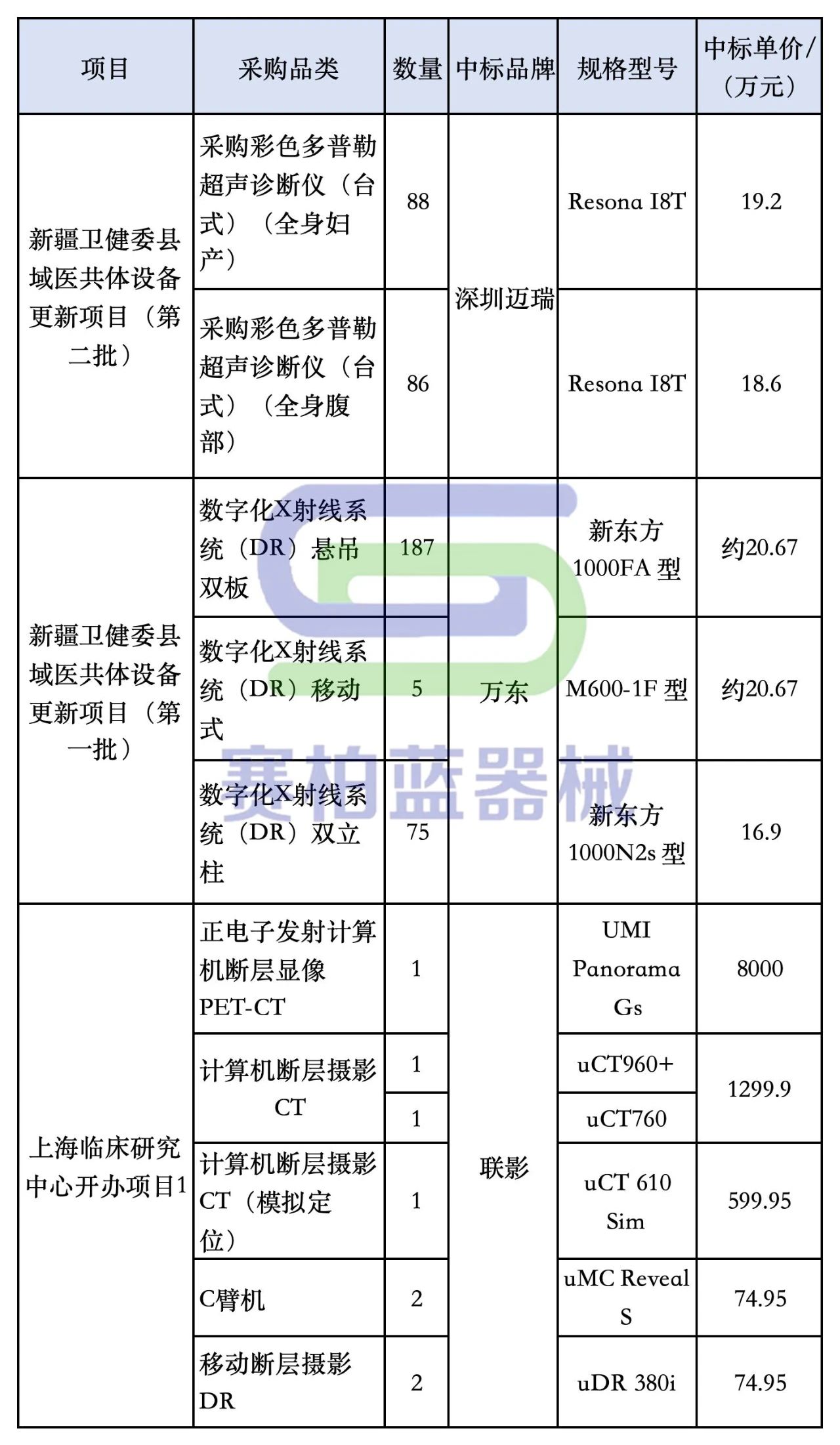 此前,海南衛健委超聲集采項目中,邁瑞醫療中標7個包共計160套超聲設備,中標總金額接近9900萬元;東軟醫療中標18套設備,中標總金額1008萬。河北衛健委縣域醫共體醫療設備更新項目中,國產品牌聯影、安科、東軟醫療包攬全部48臺CT的采購訂單,中標金額共約2.72億元。