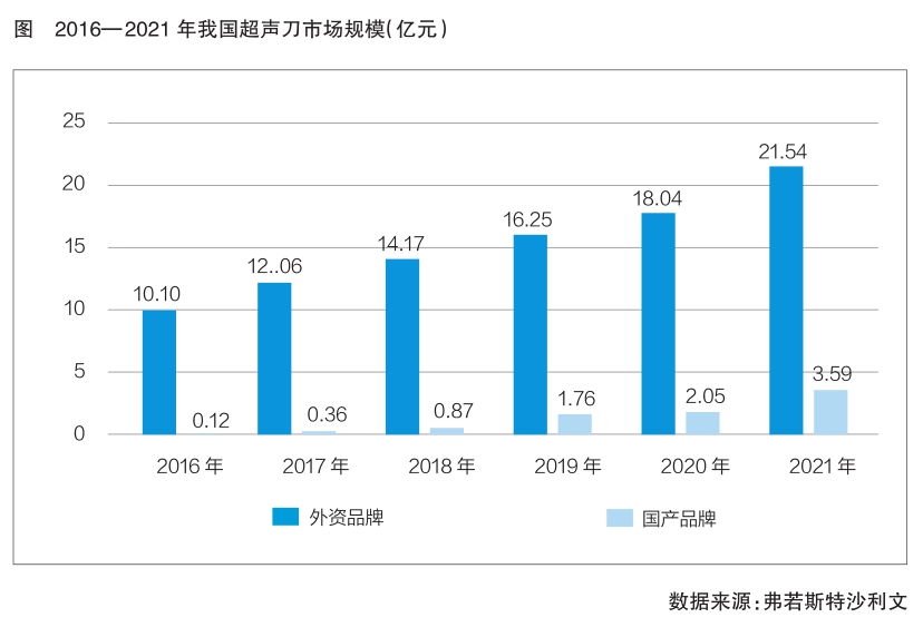 弗若斯特沙利文數(shù)據(jù)還顯示,我國(guó)超聲刀市場(chǎng)規(guī)模已從2016年的10.22億元增長(zhǎng)至2021年的25.13億元,年復(fù)合增長(zhǎng)率高達(dá)19.71%;其中,國(guó)產(chǎn)品牌市場(chǎng)規(guī)模增速較快,已從2016年的0.12億元增長(zhǎng)至2021年的3.59億元(詳見圖)。
