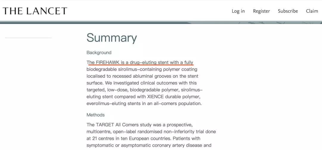 9月4日(英國時間2018年9月3日晚),世界頂級權威醫學雜志《柳葉刀》(《The Lancet》)全文刊登了中國自主研發的Firehawk冠脈雷帕霉素靶向洗脫支架系統(以下簡稱:火鷹支架)在歐洲大規模臨床試驗(TARGETAC)的研究結果,稱該研究破解了困擾世界心血管介入領域10多年的重大難題。