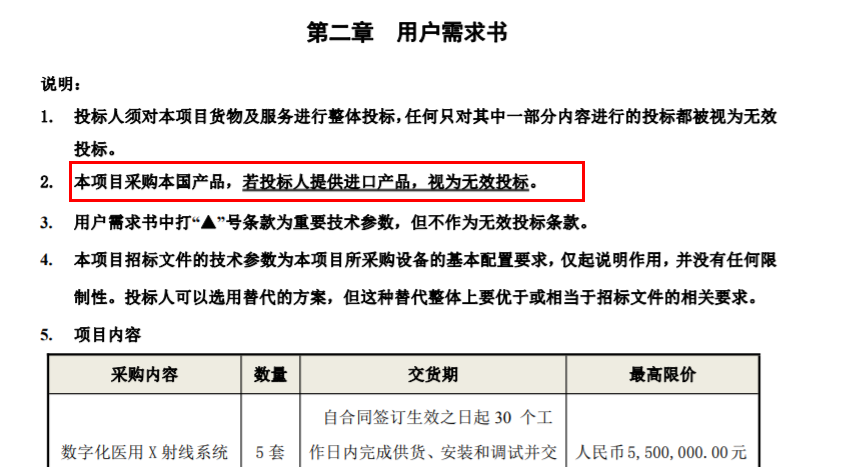 值得關注的是,南雄市衛生健康局公布的招標文件中,直接表明僅采購本國產品,若投標人提供進口產品,視為無效投標。