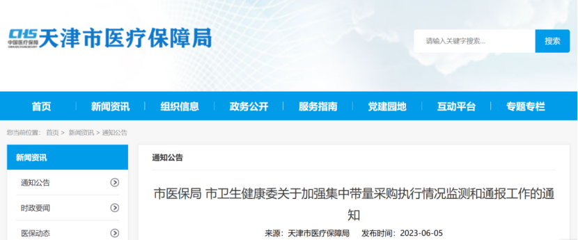 6月5日,天津市醫保局、天津市衛健委發布《關于加強集中帶量采購執行情況監測和通報工作的通知》(以下簡稱《通知》),其中明確,進一步強化藥品和醫用耗材集中帶量采購執行情況監測和通報。