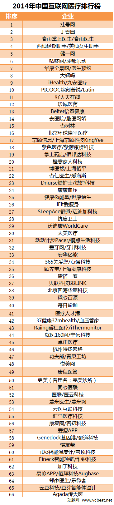 2014年有73家企業獲得融資,其中公布融資額的有66家,總融資額為69074.3萬美元。本榜單中,排名前十企業與五年排行榜上名單幾乎沒變化,顯示了大部分高額融資集中在2014年,互聯網醫療呼聲高漲,排名第一的仍為掛號網,來自騰訊產業共贏基金的1億美元融資。