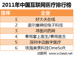 2011年有7家企業獲得融資,其中公布融資額的有6家,總融資額為1842.7萬美元。主要為覆蓋了移動醫療應用、移動設備、軟硬件結合等領域的企業。本榜單中,融資額最高的為做綜合醫療服務網站的好大夫在線,在1月份,獲得數千萬美元的B輪融資。