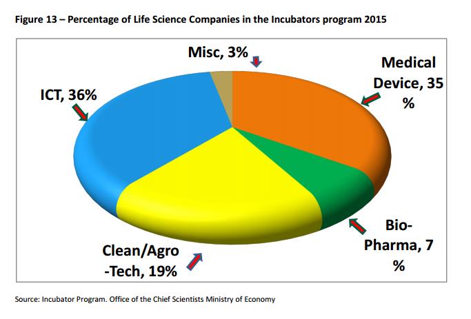 以色列政府政策上的巨大扶持和幫助對醫療器械技術起了極其重要的作用。從干預政策、政府資助、貸款及擔保項目到稅收優惠等。以色列于2011年頒布了“天使法”(angel law),鼓勵早期的投資行為。符合資格的投資者,如果投資于本土的高科技企業,就能減免相應額度的稅款。同時針對符合相應要求的高科技公司,政府將資助1/2的研發經費,而針對創業公司,政府將資助2/3的經費。此外,以色列政府成立了數十家孵化器,對創業公司可提供85%的研發費用。孵化器每年新增70~80個創業公司,過去十年(2005~2014),有696家公司進入了孵化器項目,其中有231家(33.2%)是醫療器械公司,97家(14%)是生物/制藥公司。通過下圖我們看到,2015年,孵化期內35%的創業公司都是醫療器械相關。