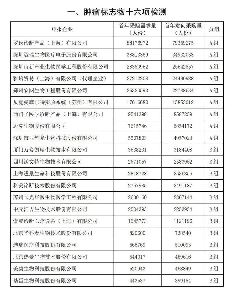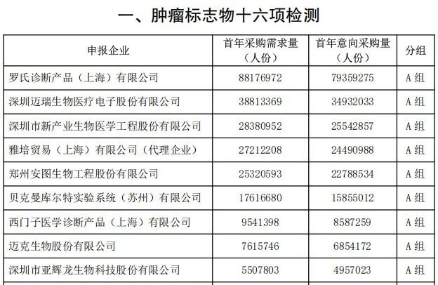 在本輪聯盟集采中,腫瘤標志物共有90家企業參與競價,其中9家企業進入A組,按首年采購需求量排序為,羅氏診斷、邁瑞、新產業、雅培、安圖生物、貝克曼、西門子、邁克生物、亞輝龍,國產品牌占比過半。