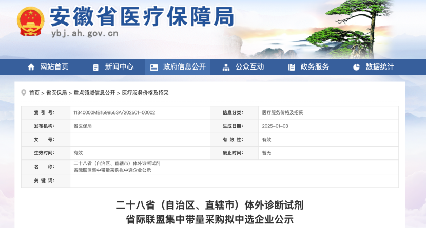 1月3日,安徽醫(yī)保局發(fā)布《二十八省(自治區(qū)、直轄市)體外診斷試劑省際聯(lián)盟集中帶量采購擬中選企業(yè)公示》,于2025年1月3日至1月7日對二十八省(自治區(qū)、直轄市)體外診斷試劑聯(lián)盟集采擬中選結(jié)果進(jìn)行公示。