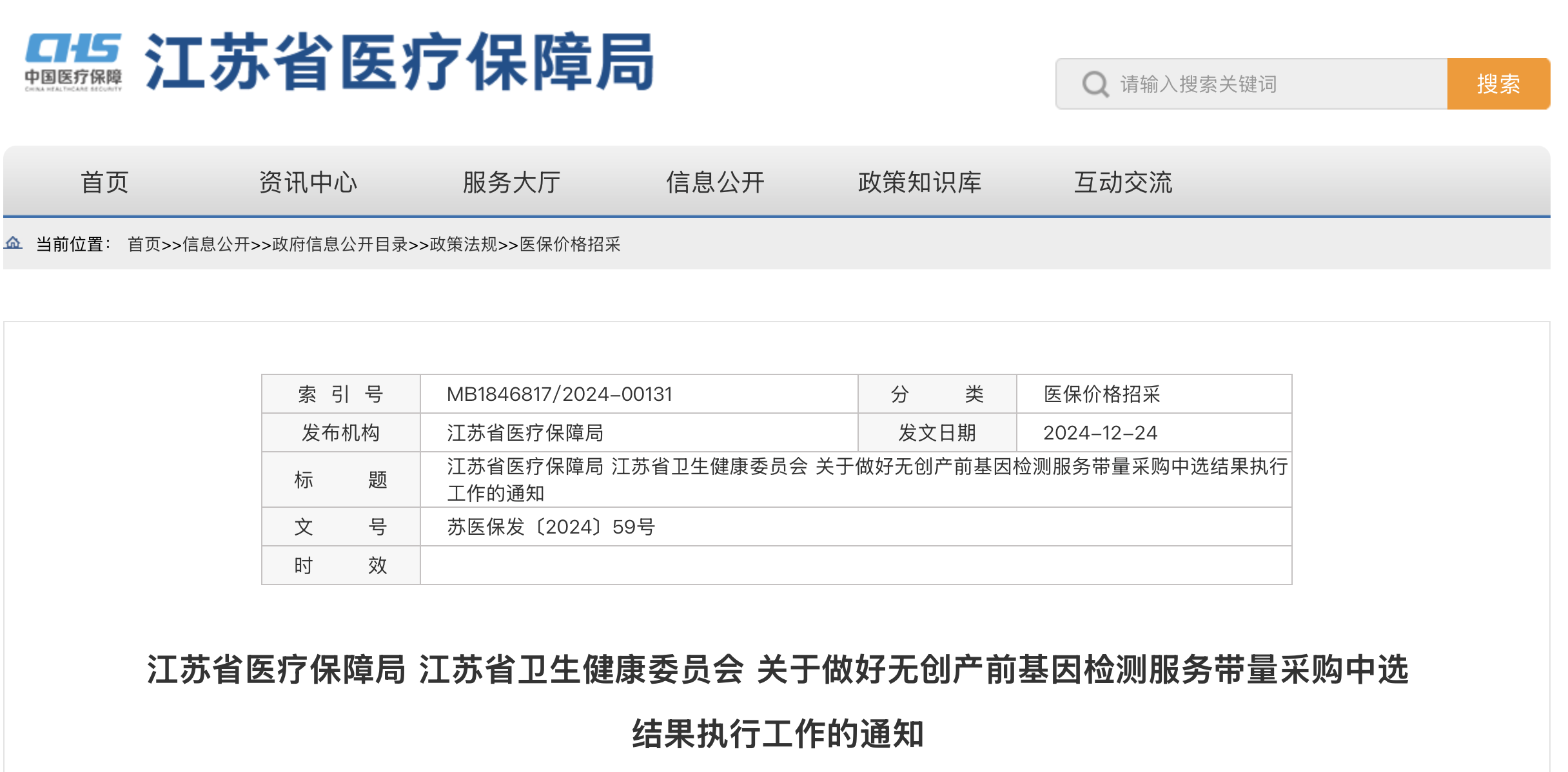 近日,江蘇醫保局發布《江蘇省醫療保障局江蘇省衛生健康委員會 關于做好無創產前基因檢測服務帶量采購中選結果執行工作的通知》,于2025年1月1日起執行本次無創產前基因檢測服務帶量采購中選結果,執行期暫定為2年。
