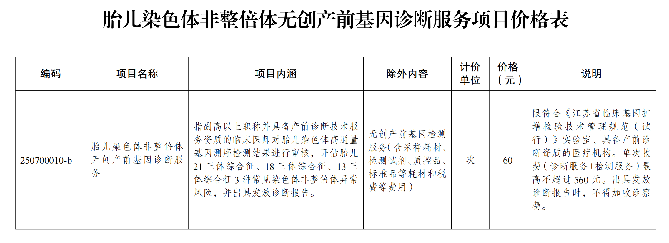 無創產前基因檢測按照“檢測服務+診斷服務”方式收取費用,診斷服務最高政府指導價為60元/次,檢測服務按集采中選結果執行,單次收費最高不超過560元。醫療機構出具診斷報告時,不得再加收診察費。省內產前診斷機構以及符合衛生健康部門規定與產前診斷機構建立合作機制的產前篩查機構,應規范開展無創產前基因檢測服務并收取費用。