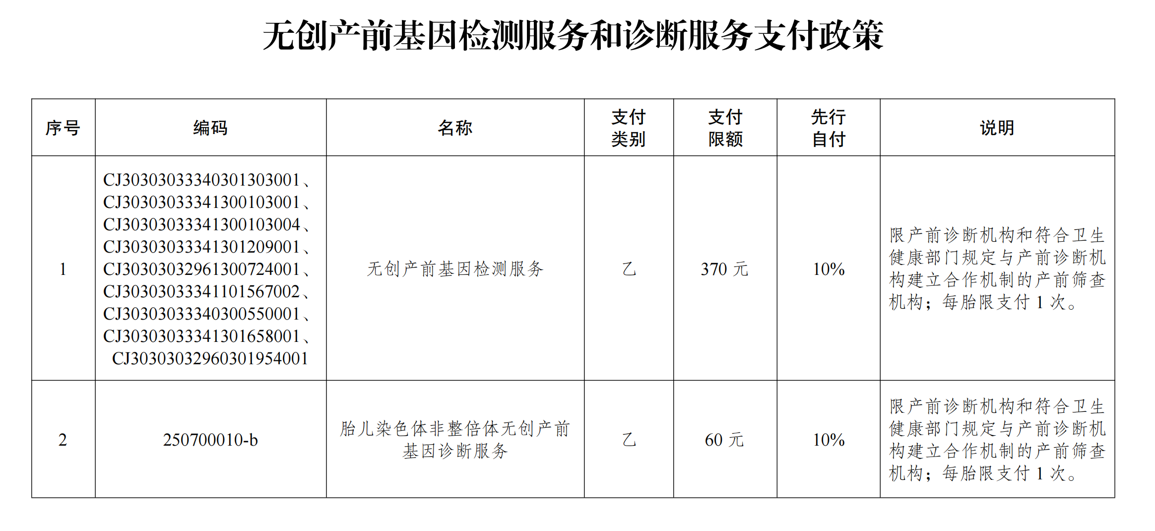 此外,將無創產前基因檢測的檢測服務和診斷服務暫納入醫保乙類支付范圍,實行門診按項目單獨支付,醫保基金支付上限為430元(含檢測服務和診斷服務費用),參保人員個人先行自付比例不高于10%,超過支付上限部分納入個人自付統計口徑。職工醫保和居民醫保除先行自付部分外,統籌基金分別按80%和70%予以支付。