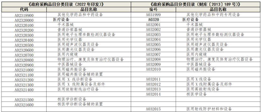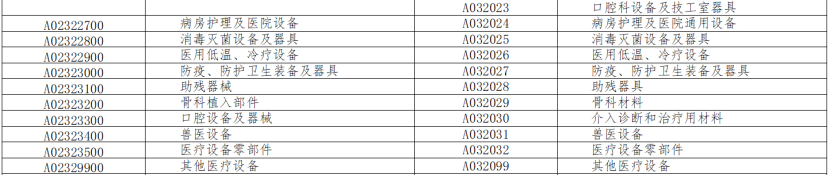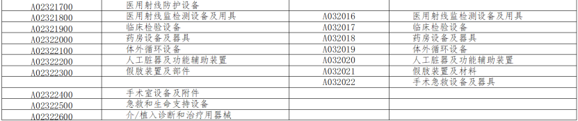 其中在醫療設備一欄中,新版目錄共收錄了36類醫療設備,較老版目錄新增了“醫用磁共振設備輔助裝置”、“核醫學診斷設備輔助裝置”,并且“手術急救設備及器具”也分成“手術室設備及附件”“手術室設備及附件”。