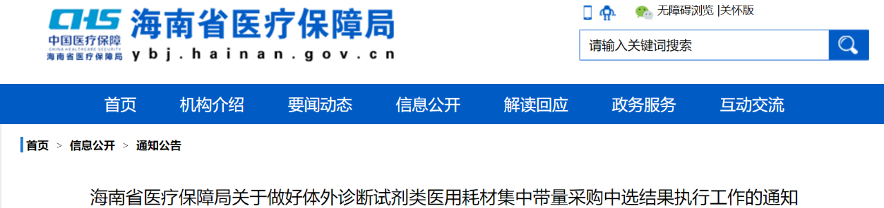 11月26日,海南醫保局發布《關于做好體外診斷試劑類醫用耗材集中帶量采購中選結果執行工作的通知》(簡稱《通知》)。