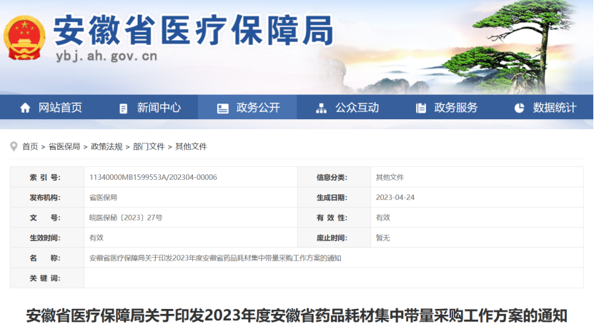 近期,安徽省醫(yī)保局發(fā)布《關(guān)于印發(fā)2023年度安徽省藥品耗材集中帶量采購工作方案的通知》(以下簡稱《通知》)。