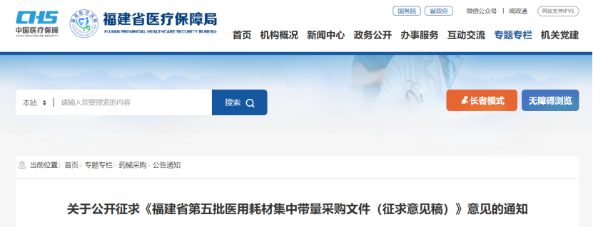7月19日,福建醫保局發布《關于公開征求<福建省第五批醫用耗材集中帶量采購文件(征求意見稿)>意見的通知》(附文末)。