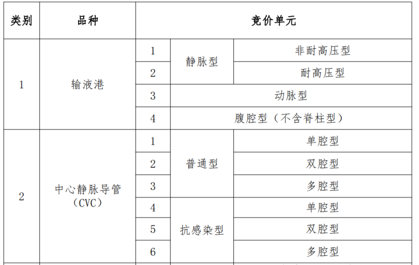 《征求意見稿》顯示,本次集中帶量采購品種為輸液港、CVC中心靜脈導管(經中心靜脈路入)、PICC中心靜脈導管(經外周靜脈路入)、造影導管、造影導絲、血管鞘、血管止血裝置等7類醫用耗材,競價單元劃分具體如下: