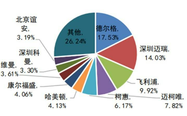 邁瑞醫療、誼安醫療、魚躍醫療等國內龍頭企業經過長期的成長和研發,在國內呼吸機市場逐漸打破了外資企業完全壟斷的情況,但目前只是搶回了中低端市場,高端產品仍主要由國外進口。在有創呼吸機市場,美敦力、德爾格、西門子等品牌在國內有著很高的認可度,占到80%以上的市場份額。公開數據顯示,2019年中國呼吸機銷售數量排名前十的企業中,僅有邁瑞醫療、深圳科曼、北京誼安三家國產品牌。