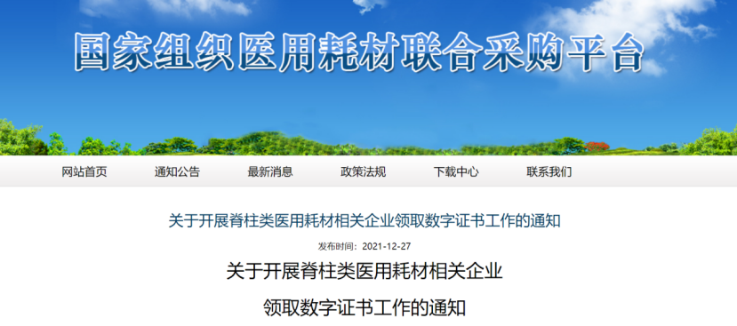 今日(12月27日),國家組織醫(yī)用耗材聯(lián)合采購平臺發(fā)布《關(guān)于開展脊柱類醫(yī)用耗材相關(guān)企業(yè)領(lǐng)取數(shù)字證書工作的通知》。