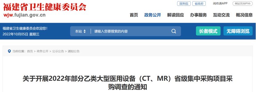 近日,福建省衛(wèi)健委發(fā)布《關(guān)于開展2022年部分乙類大型醫(yī)用設(shè)備(CT、MR)省級集中采購項目采購調(diào)查的通知》,近期擬開展2022年部分乙類大型醫(yī)用設(shè)備(CT、MR)集中采購工作。擬采購標(biāo)的包括:64排CT、1.5TMR、高端CT(256排及以上)、高端MR(3.0T及以上)。