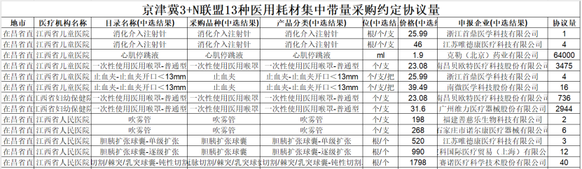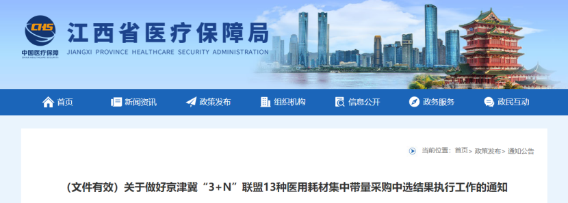 根據(jù)上述通知,自2024年8月1日零時(shí)起,江西醫(yī)療機(jī)構(gòu)執(zhí)行京津冀“3+N”聯(lián)盟13種醫(yī)用耗材集中帶量采購及骨科創(chuàng)傷類醫(yī)用耗材集中帶量采購中選結(jié)果。采購周期為2年,第一年采購周期自2024年8月1日至2025年7月31日。