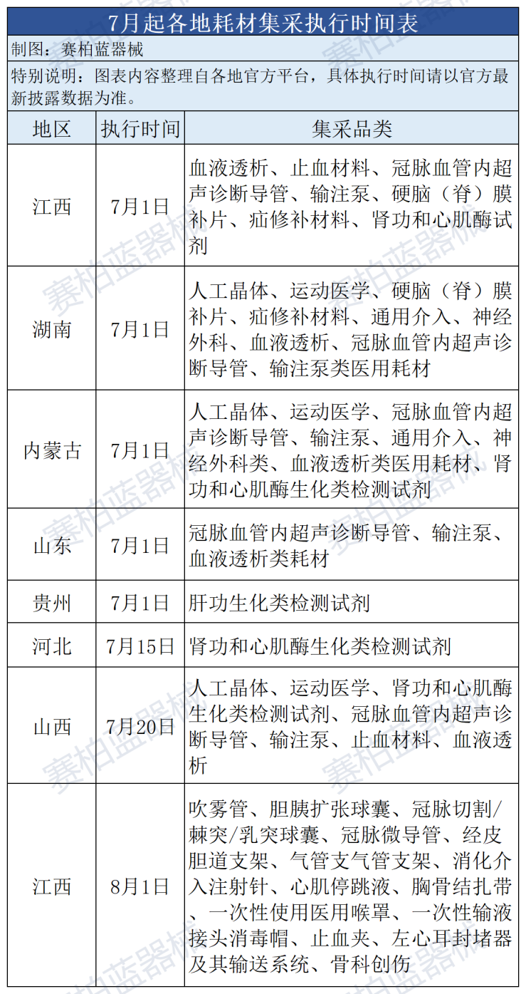據(jù)賽柏藍(lán)器械梳理,7月起,江西、湖南、內(nèi)蒙古、山西、河北、貴州、山東等地將陸續(xù)執(zhí)行多類耗材集采結(jié)果,耗材降價(jià)鏈條持續(xù)震蕩。