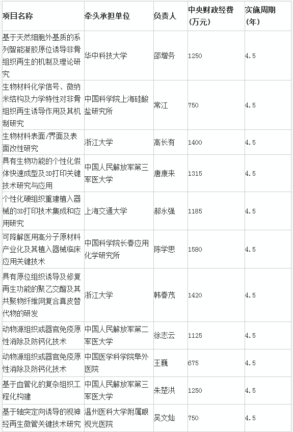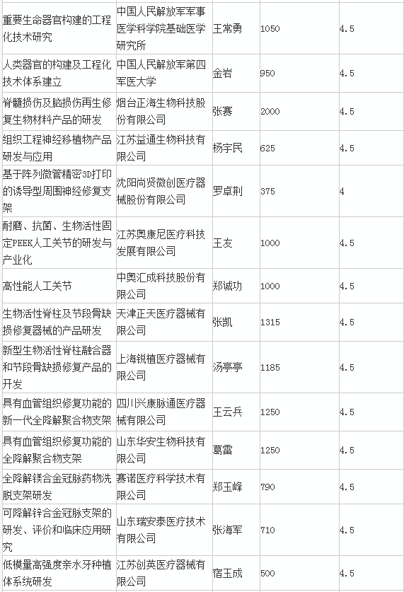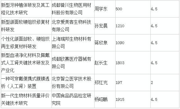 在31個“生物醫(yī)用材料研發(fā)與組織器官修復替代”項目中,有17個是由醫(yī)療器械公司來牽頭承擔的。