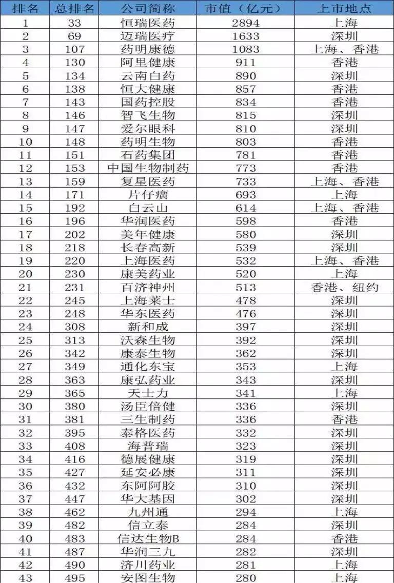 在這次排名中,共計43家醫藥相關的企業入圍,總市值達到了25822億元,占所有500強企業總市值的3%。