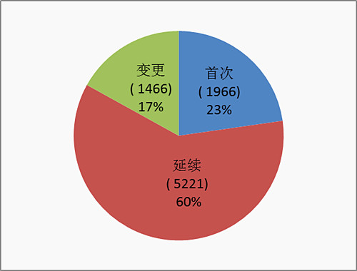 按照注冊式形區(qū)分,首次注冊1966項占全部注冊的23%,延續(xù)注冊5221項占全部注冊申請的60%,許可事項變更注冊1466項占全部注冊申請的17%。注冊形式比例情況見圖6。