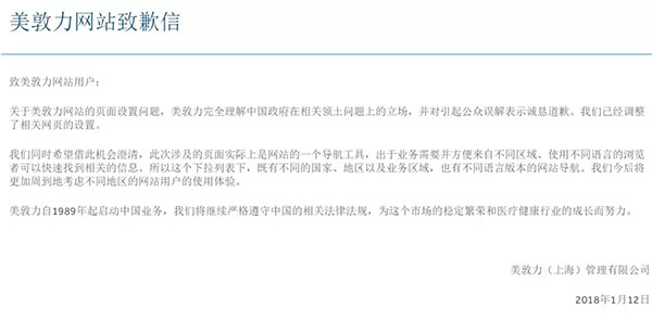 關于美敦力網站的頁面設置問題,美敦力完全理解中國政府在相關領土問題上的立場,并對引起公眾誤解表示誠懇道歉。我們已經調整了相關網頁的設置。