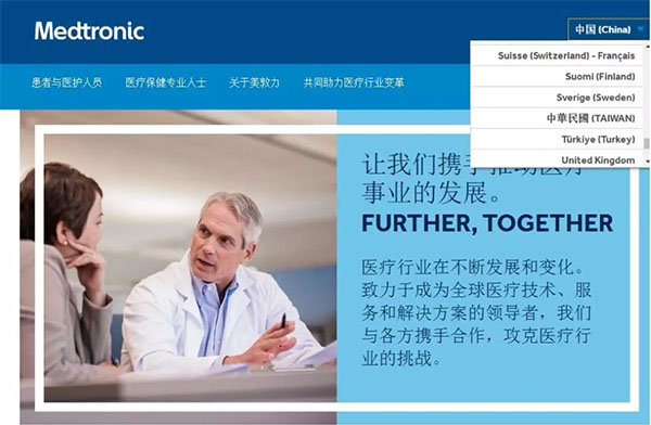 官網“國家”選項出現“臺灣”,美敦力被抓包