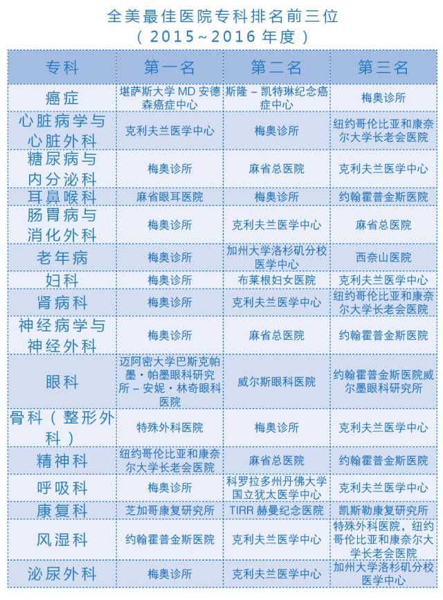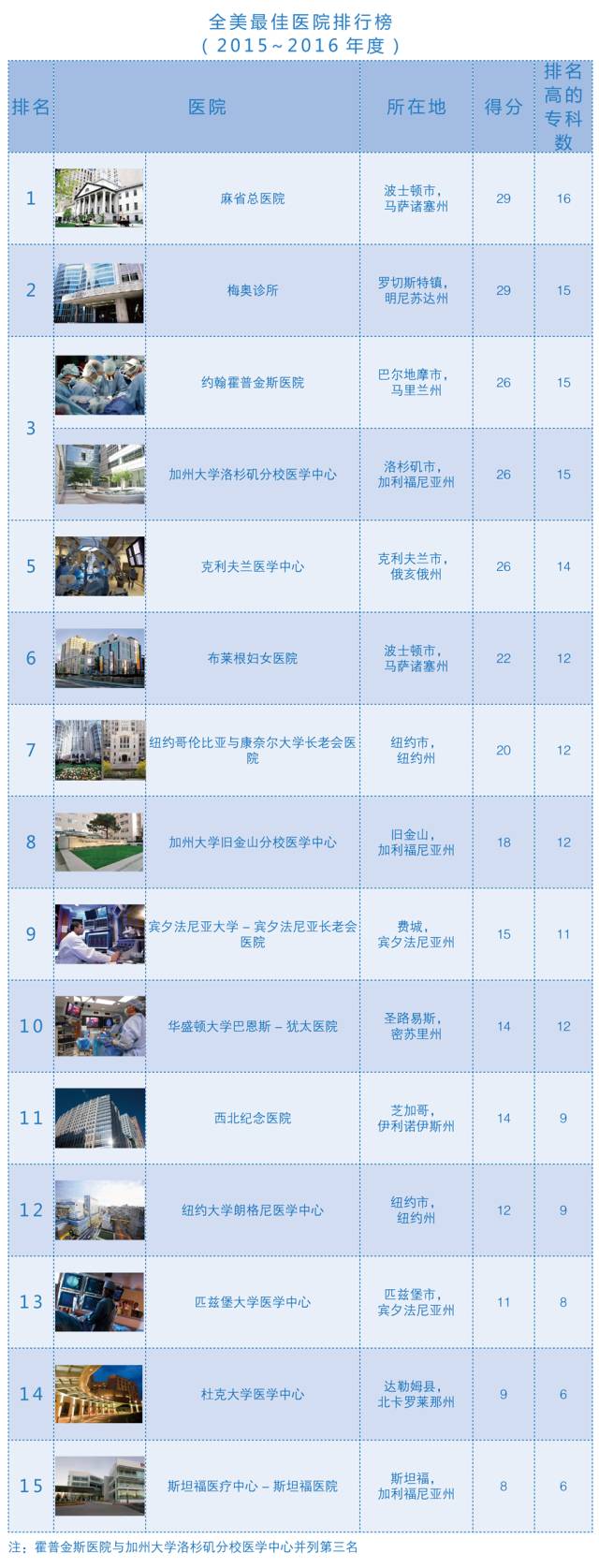 在2015~2016年度的全美最佳醫院排行榜中,137家醫院——不足全美醫療機構總數的3%——成功在至少一個??祁I域進入最佳排名榜單。而至少在6個專科領域進入全美前20名的醫院,才能在綜合榜單上占有一席之地。今年,共15家醫院成功登榜。