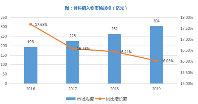 得益于我國龐大的人口基數(shù)、社會老齡化進(jìn)程加速和醫(yī)療需求不斷上漲,加之進(jìn)口替代的大背景,骨科行業(yè)持續(xù)高度景氣。據(jù)Eshare醫(yī)械匯測算,2019年骨科植入市場規(guī)模約為304億元,增長率為16.03%。