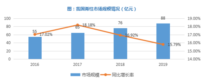 脊柱被稱之為人體的“第二生命線”,是人體的“支柱與棟梁”。隨著老齡化的加劇,脊柱領(lǐng)域的發(fā)病率越來越高,比如頸椎病、骨質(zhì)疏松、腰椎間盤突出等等,并呈現(xiàn)出年輕化趨勢。據(jù)Eshare醫(yī)械匯測算,2019年脊柱市場銷售規(guī)模約為88億元,較2018年增長15.79%,脊柱市場保持高速增長。