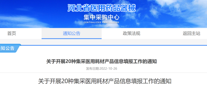 10月26日,河北省醫用藥品器械集中采購中心發布《關于開展20種集采醫用耗材產品信息填報工作的通知》,擬于近期組織開展人工骨填充材料等20種醫用耗材集中帶量采購,現組織開展相關產品信息填報工作。