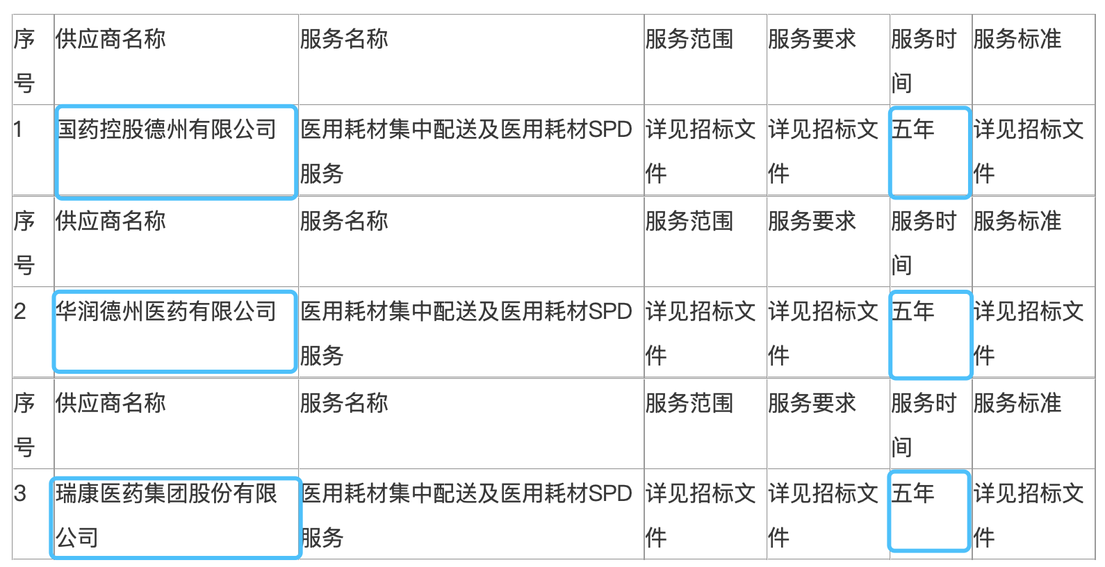 文件指出,平原縣第一人民醫(yī)院的年度耗材、試劑采購(gòu)預(yù)算金額為4000萬元,服務(wù)周期為5年,總金額為2億。國(guó)藥控股德州有限公司、華潤(rùn)德州醫(yī)藥有限公司、瑞康醫(yī)藥集團(tuán)股份有限公司3家企業(yè)中標(biāo)。