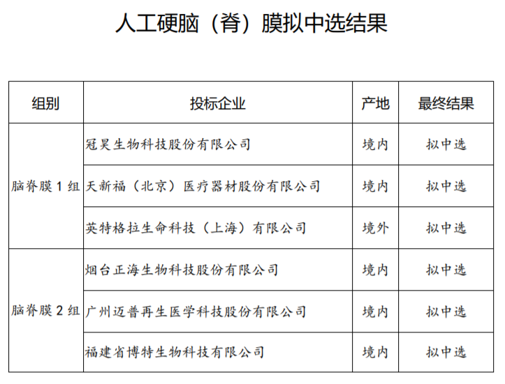 人工硬腦(脊)膜擬中選結(jié)果涉及冠昊生物、天新福、英特格拉生命科技等6家械企,在此之前,共10家械企符合申報(bào)條件;
