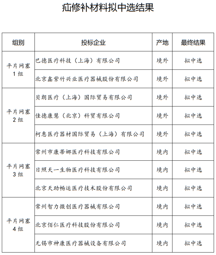 疝修補(bǔ)材料擬中選結(jié)果涉及巴德醫(yī)療、貝朗醫(yī)療、柯惠醫(yī)療等11家械企,在此之前,共26家械企符合申報(bào)條件。