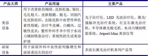 公司主要從事激光和其他光電類(lèi)醫(yī)療及美容設(shè)備研發(fā)、生產(chǎn)、銷(xiāo)售和代理,向用戶(hù)提供多種激光和其他光電類(lèi)醫(yī)療及美容解決方案,主要產(chǎn)品包括面向美容和泌尿外科等領(lǐng)域的激光和其他光電類(lèi)醫(yī)療及美容設(shè)備。