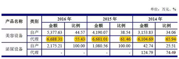 從金額數(shù)量上可以看出,公司在2016年之前仍然以代理產(chǎn)品為主,2014年代理的設(shè)備占總銷(xiāo)售設(shè)備額的65%以上,往后代理設(shè)備的比例呈現(xiàn)遞減的趨勢(shì)。