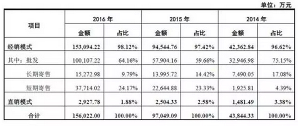 報(bào)告期內(nèi)公司銷(xiāo)售收入主要來(lái)源于經(jīng)銷(xiāo)模式業(yè)務(wù)收入,占比分別為96.62%、97.42%和98.12%。