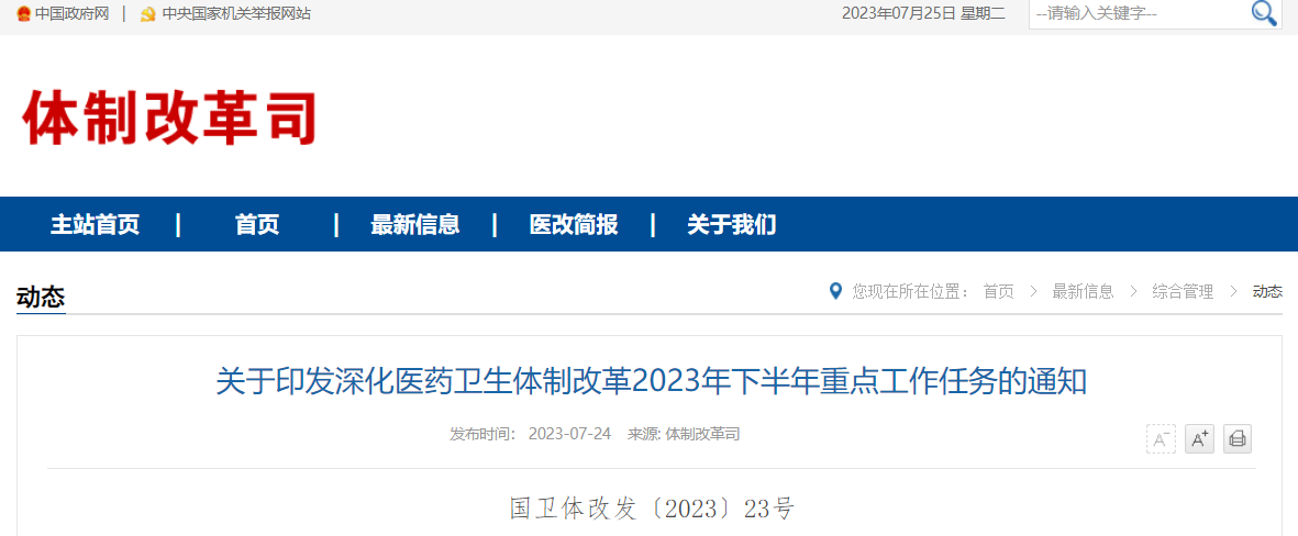 7月24日,國(guó)家衛(wèi)健委官網(wǎng)發(fā)布《關(guān)于印發(fā)深化醫(yī)藥衛(wèi)生體制改革2023年下半年重點(diǎn)工作任務(wù)的通知》(簡(jiǎn)稱(chēng)《通知》)。