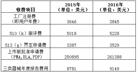 美國FDA于8月3日正式發布了2016財政年度醫療器械不同申請途徑的審評費用和用戶年費標準,該收費標準如下表所示: