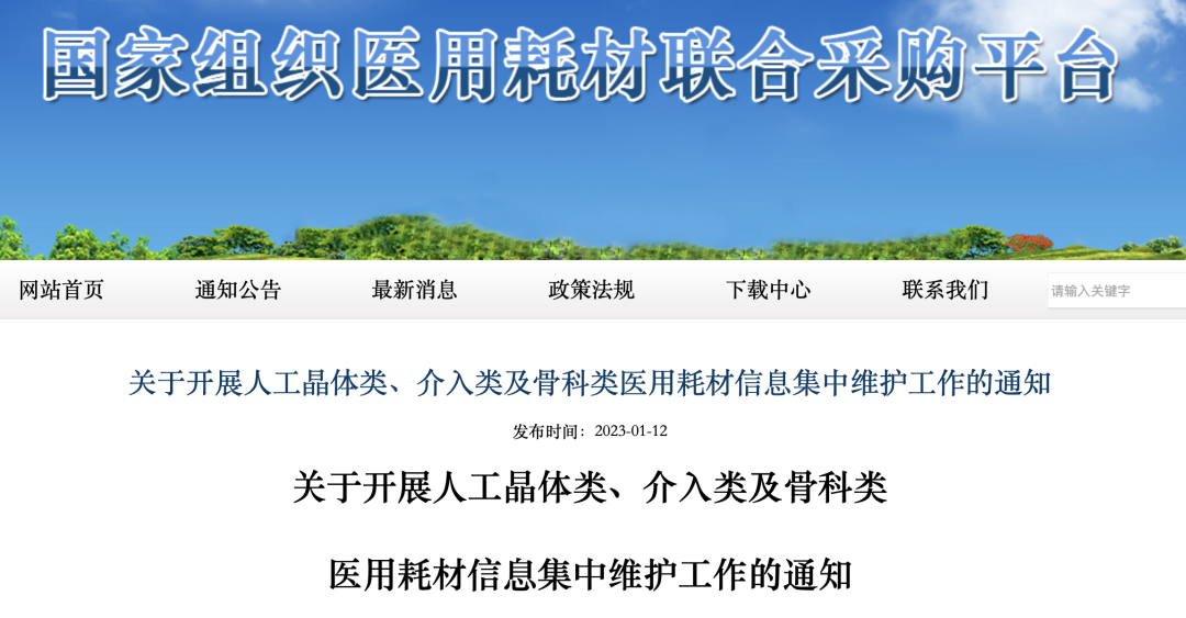 近日,國(guó)家組織高值醫(yī)用耗材聯(lián)合采購(gòu)辦公室發(fā)布《關(guān)于開(kāi)展人工晶體類(lèi)、介入類(lèi)及骨科類(lèi)醫(yī)用耗材信息集中維護(hù)工作的通知》及《關(guān)于召開(kāi)人工晶體類(lèi)、介入類(lèi)及骨科類(lèi)醫(yī)用耗材信息維護(hù)工作企業(yè)培訓(xùn)會(huì)的通知》。