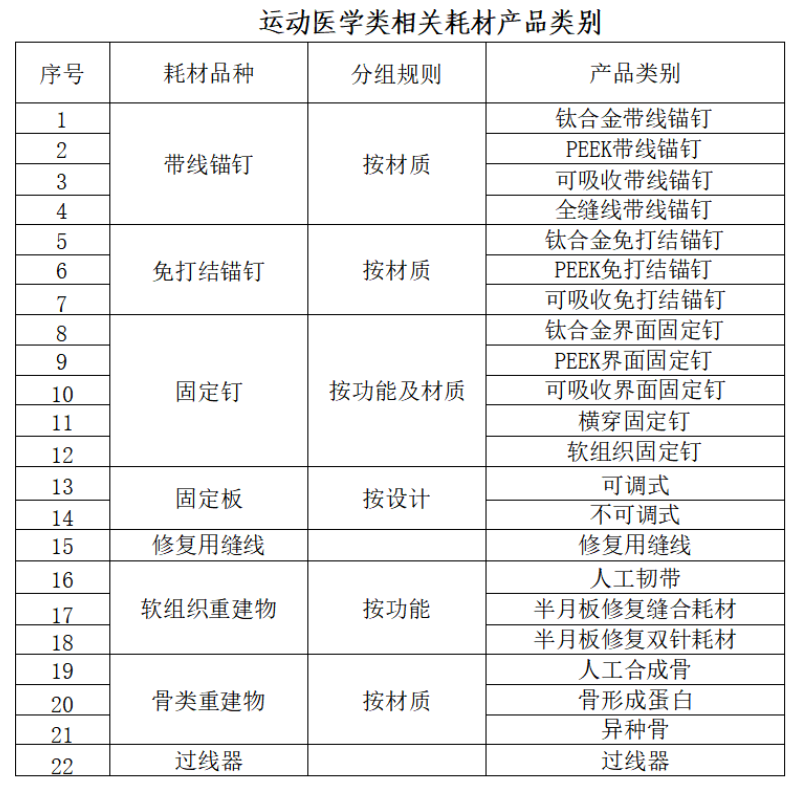 2.運動醫學類相關耗材: 獲得中華人民共和國醫療器械注冊證的帶線錨釘、免打結錨釘、界面固定釘、橫穿固定釘、軟組織固定釘、可調式固定板、不可調式固定板、修復用縫線、人工韌帶、半月板修復縫合耗材、半月板修復雙針耗材、人工合成骨、骨形成蛋白、異種骨、過線器。