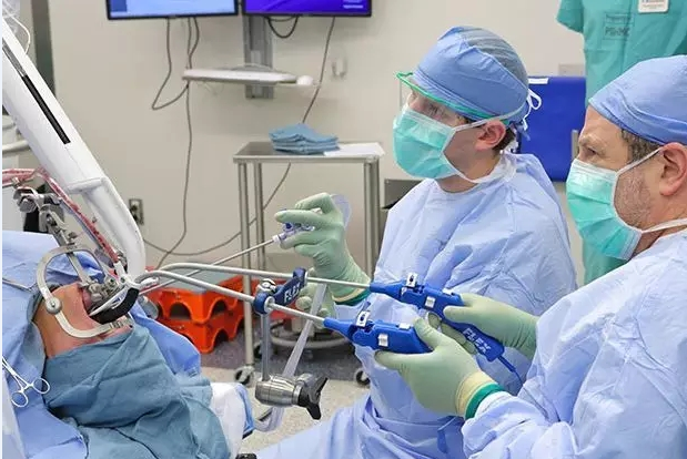 可彎曲機器人The Flex 就如其名所示,是一種柔性管狀機器人。醫(yī)生將其插入患者的嘴巴,通過操縱桿來控制其移動。醫(yī)生可通過前端有的攝像頭在患者氣管內移動機器人。因其可看到并到達非常難到達的解剖區(qū)域,諸如Goldenberg一樣的外科醫(yī)生開始使用可彎曲機器人The Flex進行手術,這樣就不用在患者下巴或其他位置進行切口手術了。Goldenberg說這種方式不僅手術快速便捷,醫(yī)療成本更低,同時還不會給患者留下創(chuàng)口。