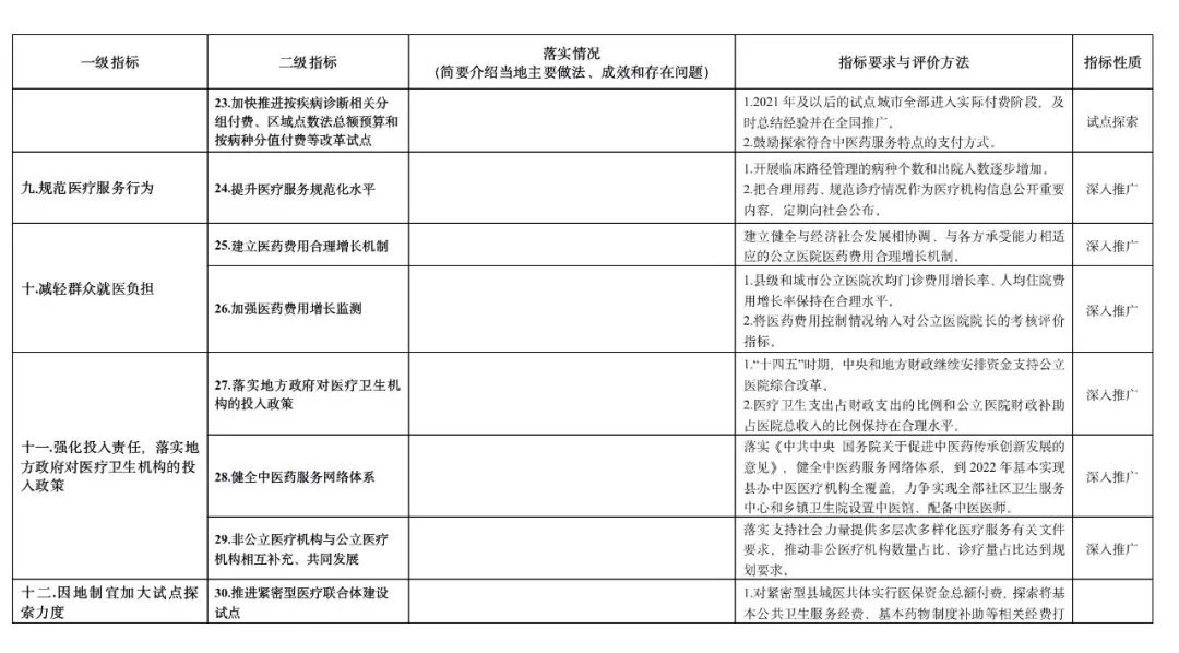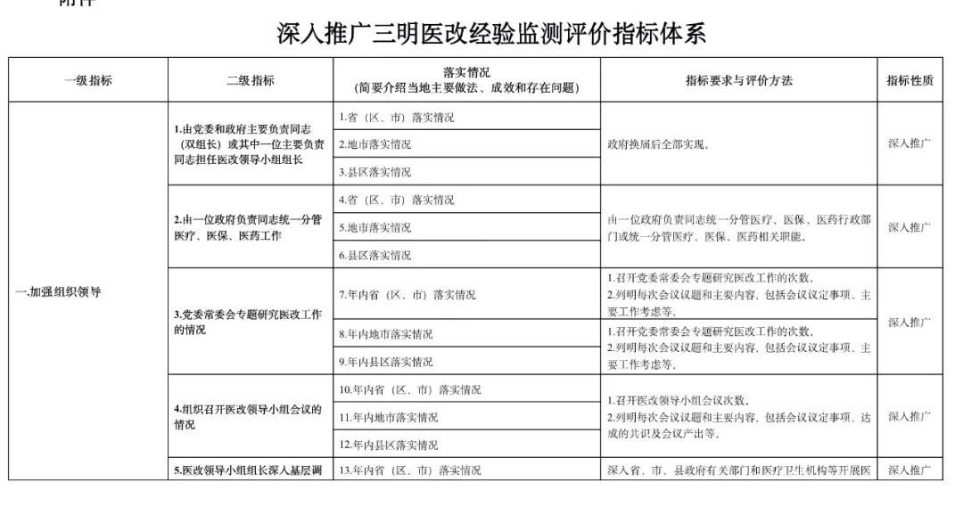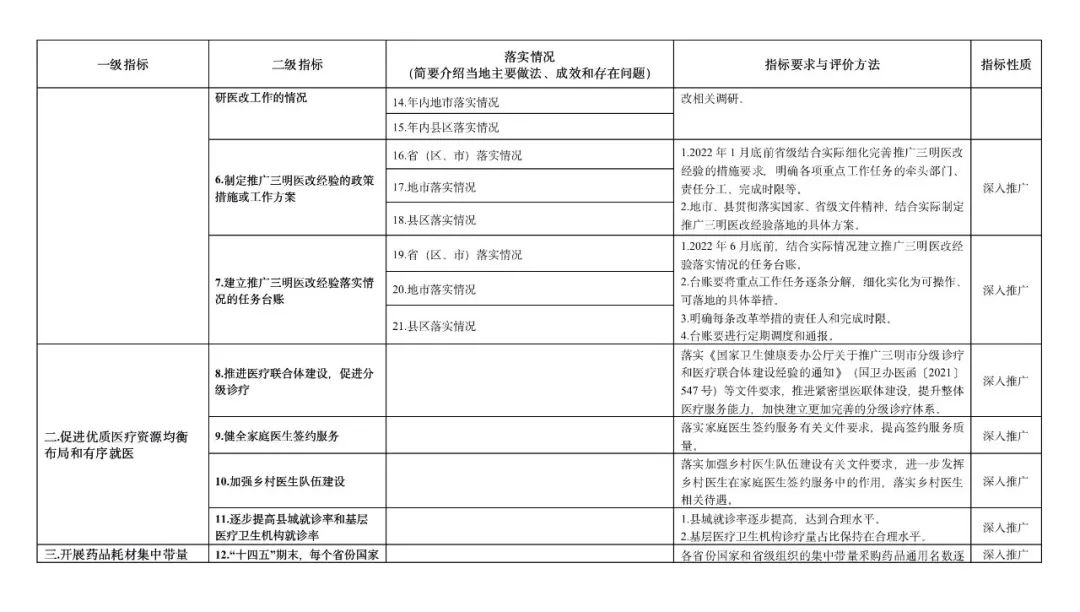 《通知》要求,重點監測評價地方各級醫改領導小組學習推廣三明醫改經驗,深化醫療、醫保、醫藥聯動改革,促進優質醫療資源均衡布局,加快推動實現大病重病在本省解決、常見病多發病在市縣解決、頭疼腦熱等小病在鄉村解決,加快健全維護公益性、調動積極性、保障可持續的公立醫療機構運行新機制等有關改革情況。
