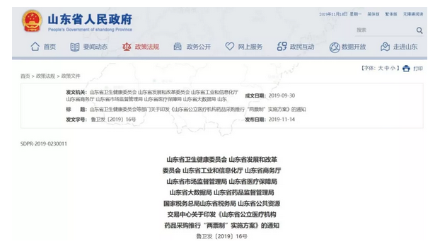 《實施方案》由山東省衛生健康委員會、山東省發展和改革委員會、山東省工業和信息化廳、山東省商務廳、山東省市場監督管理局、山東省醫療保障局、山東省大數據局、山東省藥品監督管理局、國家稅務總局山東省稅務局、山東省公共資源交易中心10個部門聯合印發。