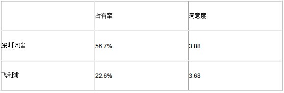在監護類產品,深圳邁瑞以56.7%的市場占有率占據第一位,遠遠超過占有率為22.6%的飛利浦;而在滿意度方面也是以0.2的優勢占據首位。可以說邁瑞在該領域完成了對飛利浦的“雙殺”,成為民族企業的驕傲。