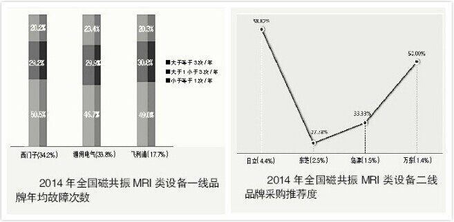 以上公布的數據直觀的反映出了,去年度各類產品線的主流品牌和用戶的滿意度。此外,這次報告增加了“設備年故障次數和推薦”兩項附加指標,使得報告數據對于采購更具參考性。以CT類、磁共振MRI類和超聲影像類為例: